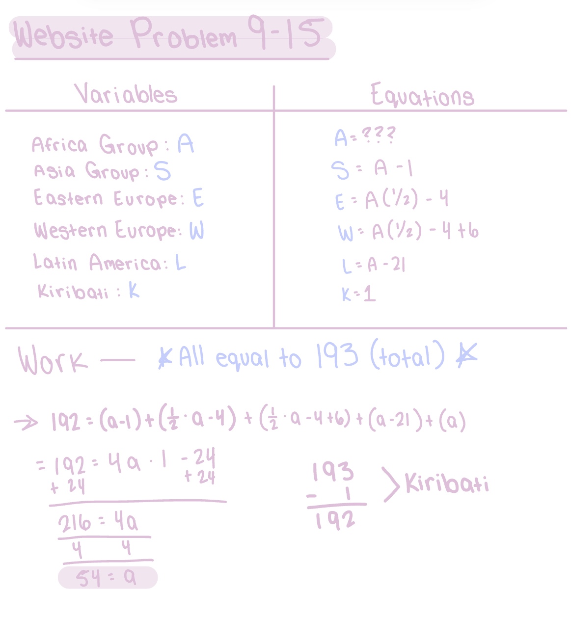 This is the work done in order to solve for how many countries each regional group had. This includes the equations and set variables created