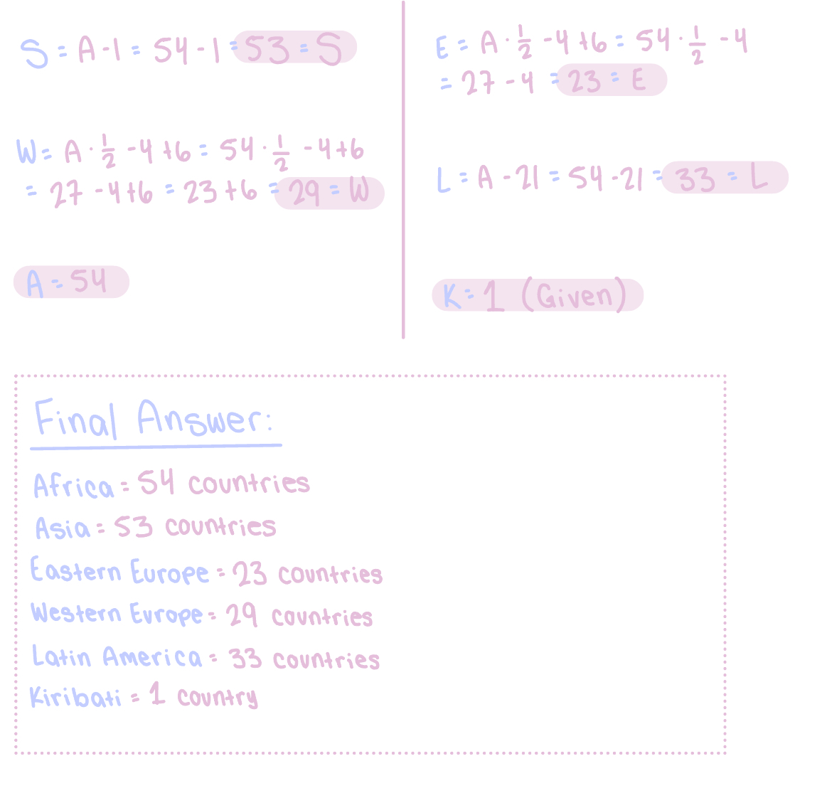 - Once having found the given formulas for each region, as shown above, we then set it to equal 193 since there are 193 countries total in the United Nations. Knowing the given amount of countries in Kiribati, we firstly subtracted 1 from 193 giving us 192. Once we did this we then put all the following formulas we previously created and put them in parentheses and summed them all up. By combining like variables, we have a total of 4 A variables and -24. We then continued to solve by adding 24 to both sides to cancel it out and isolate the A variable, therefore leaving us with 216=4a, and once dividing, leaving A to equal 54.